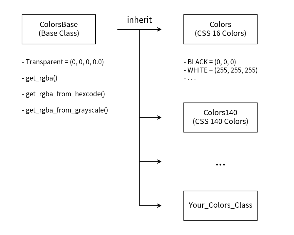 However, using RGB can be inconvenient for basic colors. Therefore, we provide Color classes. Currently, we offer the following classes: