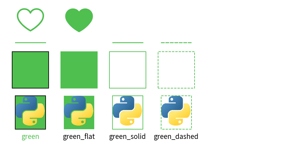 flat: No border (actually has a white color)solid: Shape has an outline but no filldashed: Dashed line, dashed outline